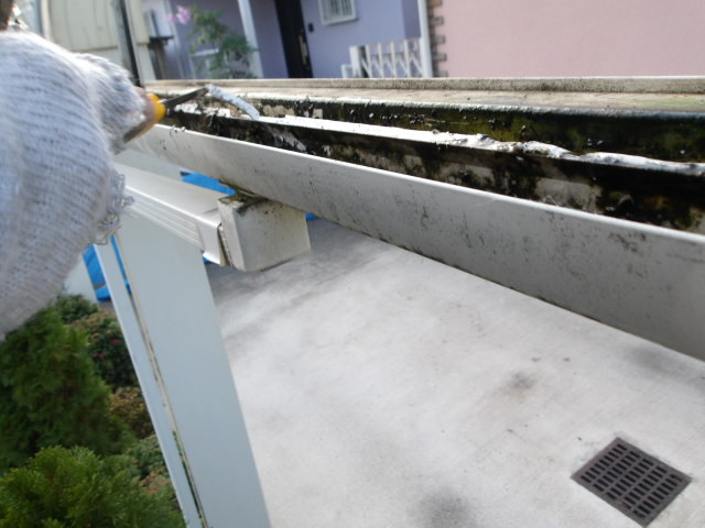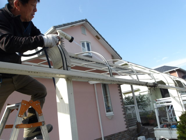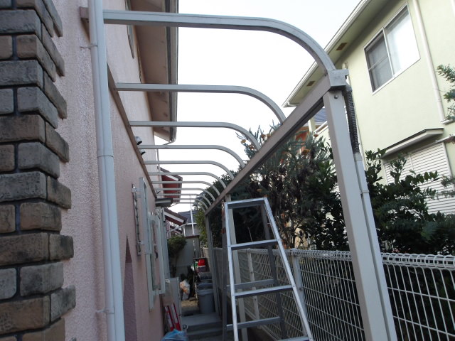 本日の現場レポート、足場架設前のカーポート・テラスのパネル撤去。