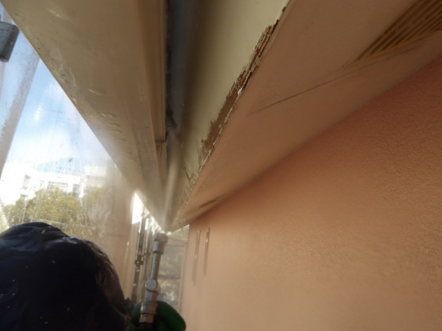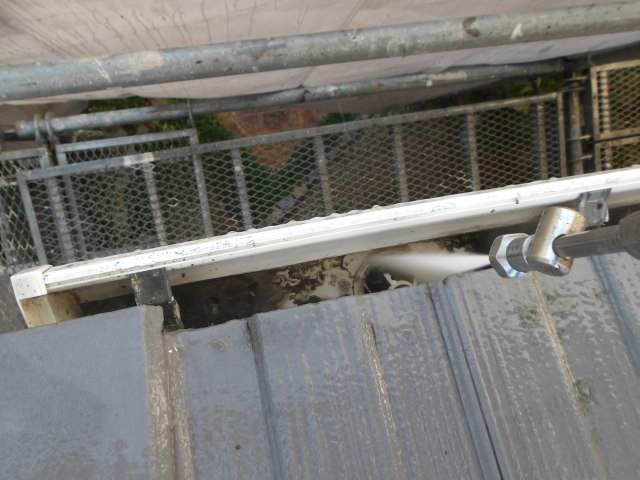 竪樋・バルコニーンドレンの落とし口は、ゴミ詰まりが無い様念入りに洗浄。