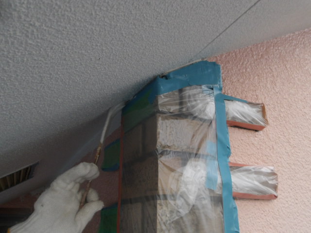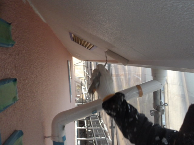各部養生、西・北面軒天井 湿気透過型塗料下塗り。